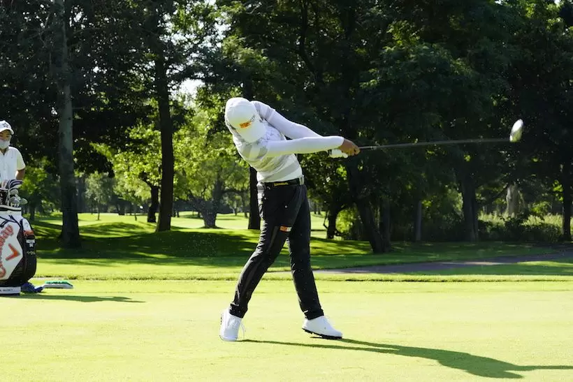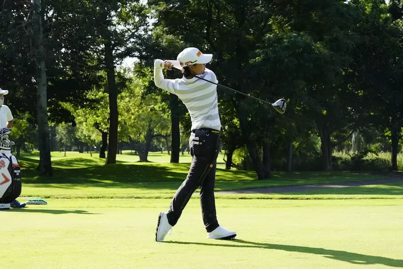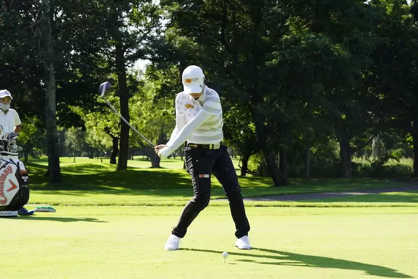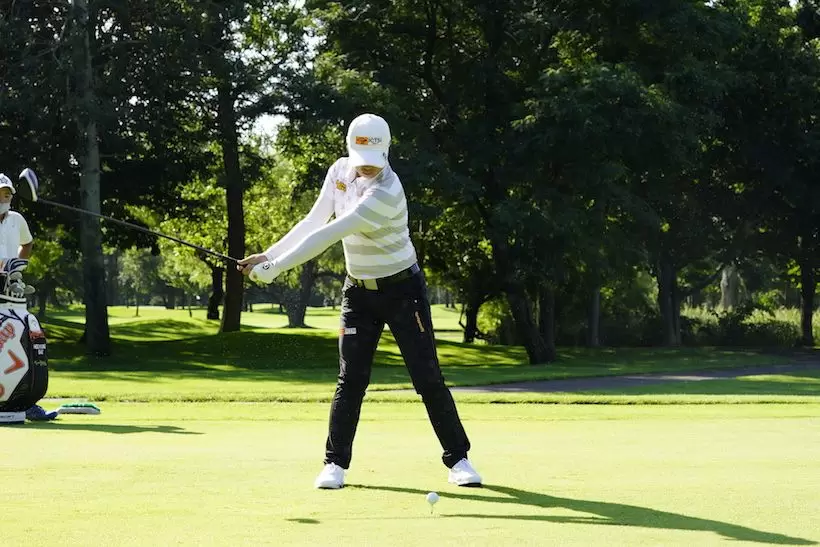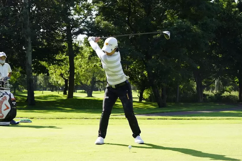 前傾角度がキープされ、両腕がまだほぼ伸びている状態で大きいフォローが取られています。フォローでの右腕の張りとトップの左腕の張りから、笹生選手の体幹や足腰、腕力などの身体的な強さがうかがえます。