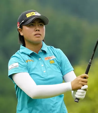これは切り返す寸前の写真ですが、左肩が右ヒザ上までしっかり捻転され、女子の中では珍しいくらい左腕がピンと張り、力強く叩けるトップが作られています。トップでグリップが頭の後ろに隠れてしまうアマチュアの方が多いので、笹生選手のトップの形を参考にするといいと思います。笹生選手は切り返し後、クラブヘッドをシャローさせるので、フェース向きは少しシャット気味です。