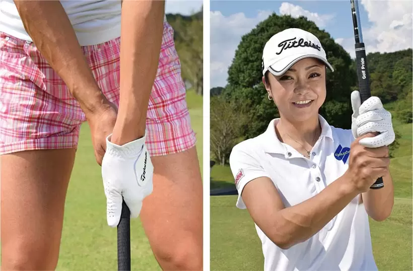 両手を通常のグリップと逆にしてクラブを持つ。慣れないうちは違和感があるが、練習の効果は高い。