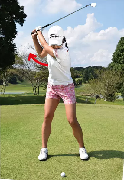 バックスイングでは左肩が引っ張られるので強い捻転が感じられる。