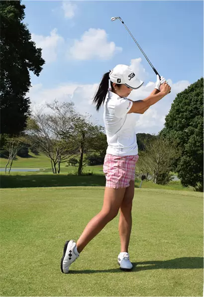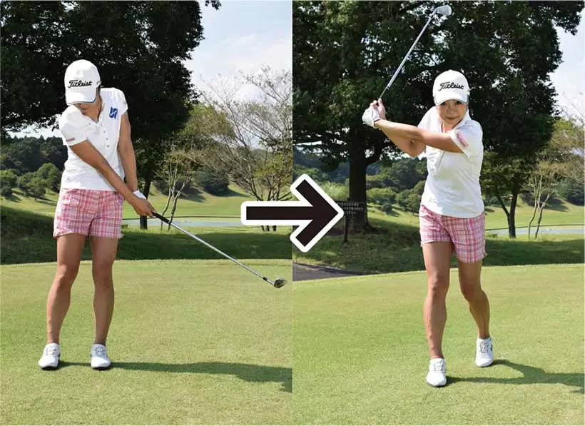 右足を前に踏み出してからバックスイングへと移る。