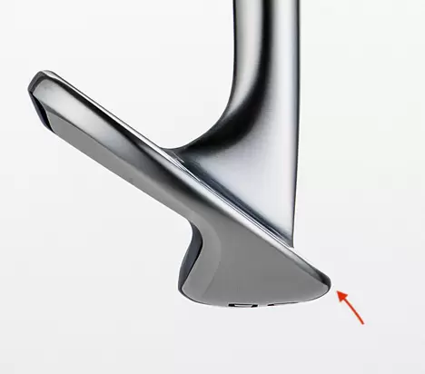 矢印で指した部分がリーディングエッジ。ソールからリーディングエッジにかけての角度が鈍角で、面が生まれている。これがささりにくさに繋がる。