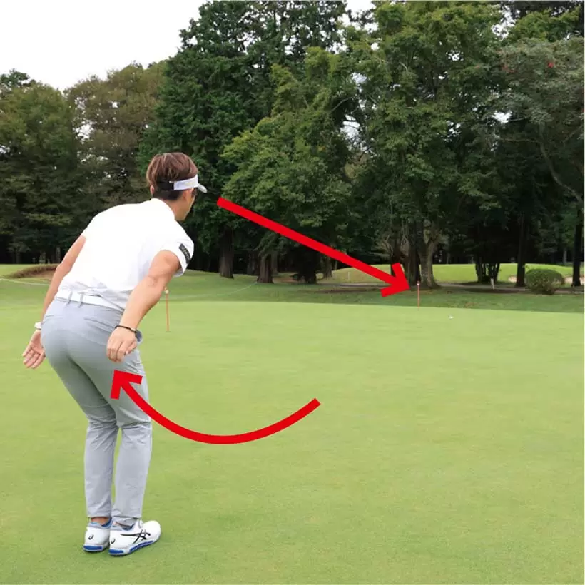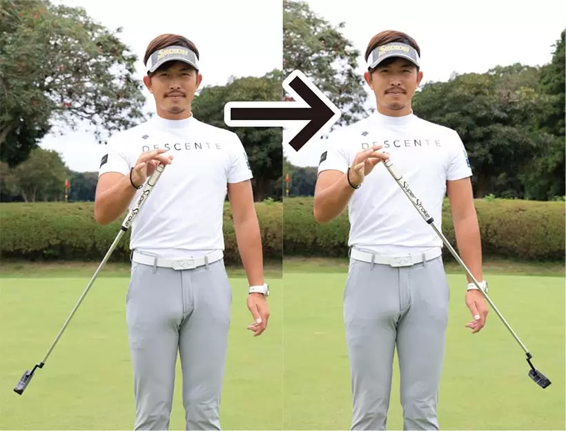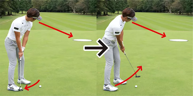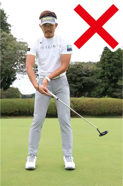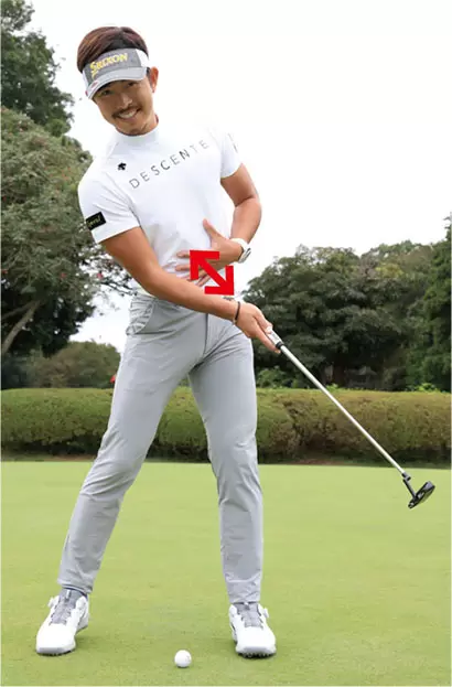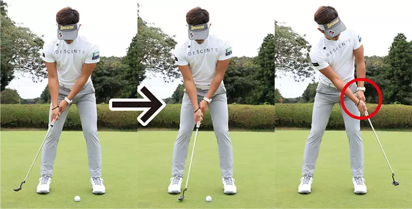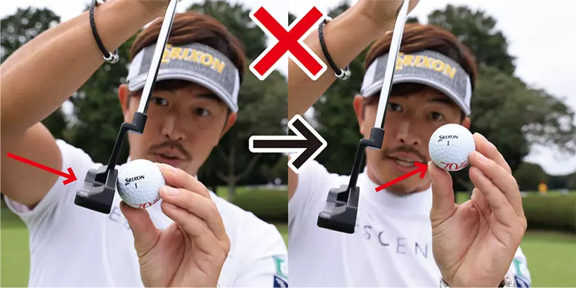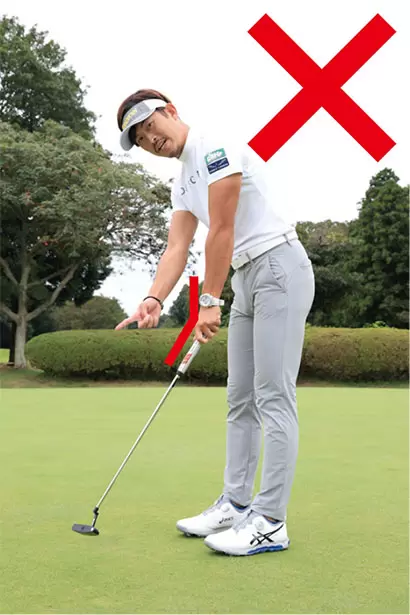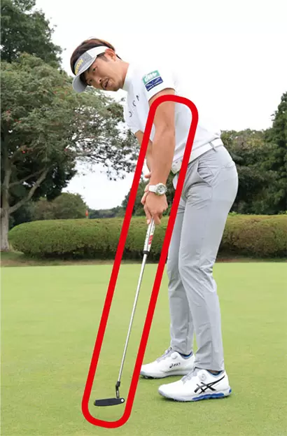左ヒジから先とパターが真っすぐとなるように手元を浮かせると、手首をロックしやすい。