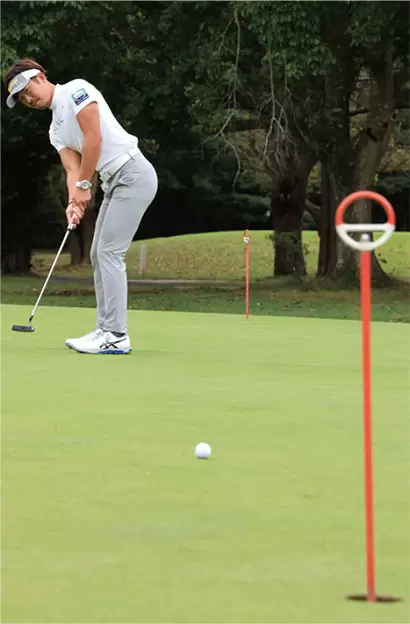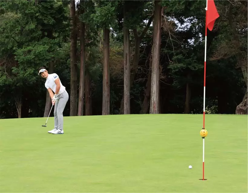 スタート前の練習グリーンでは遠くのカップを目標にして、右手でボールをコロがす練習もしておくといい。