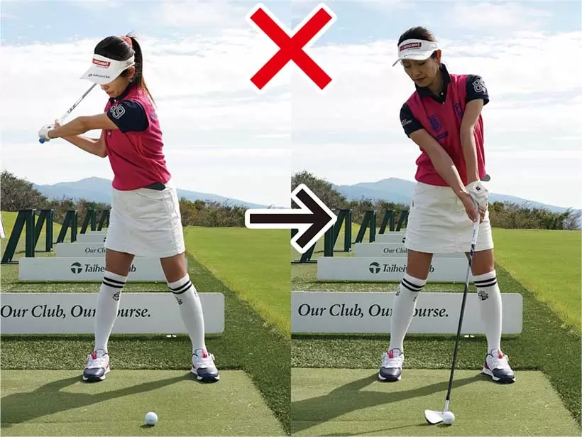 ダウンスイングで上体が起きて、インパクトで手首が伸びてしまう。これもシャンクの原因となる。