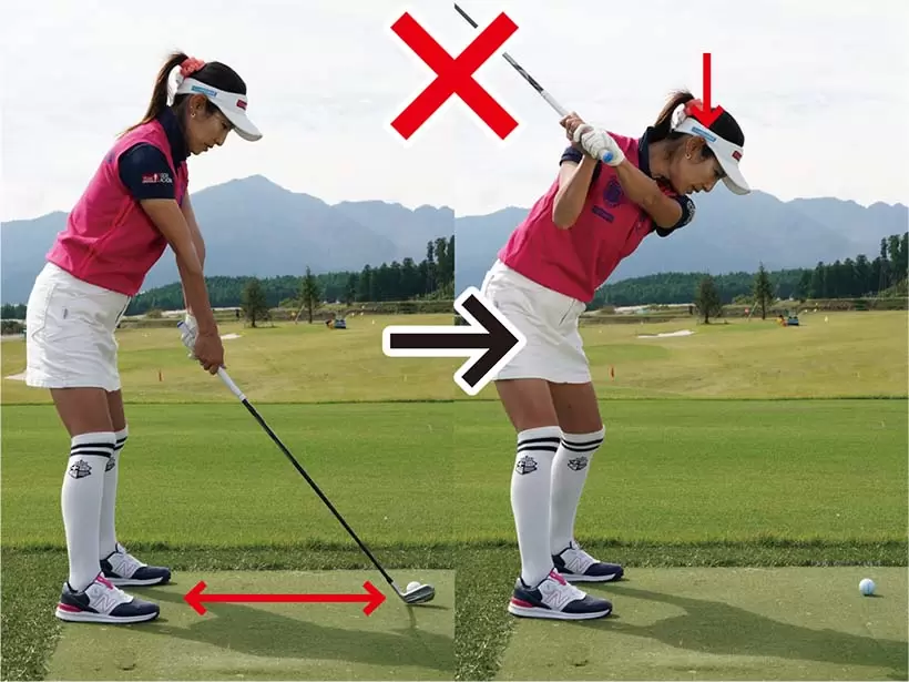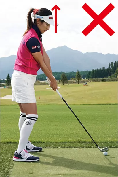 ボールから離れて構えるとバックスイングでカラダがボールに近づこうとして頭が下がりやすい。