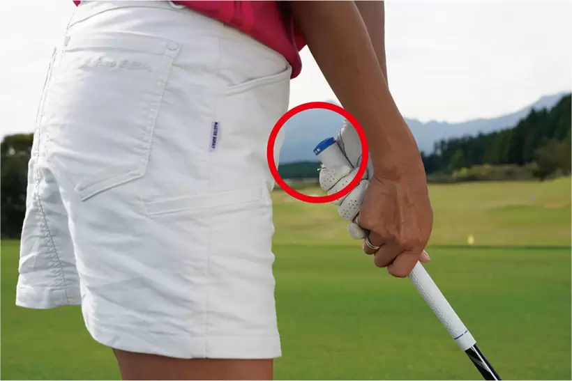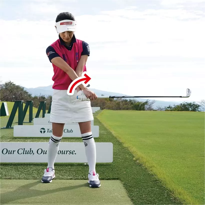 両手を返せばフェースがスムーズにターン。ボールをしっかりつかまって、シャンク病が解消される。