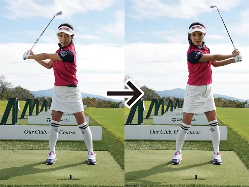 スイングの大きさはトップで左腕が、フィニッシュでは右腕が水平となるのが目安。