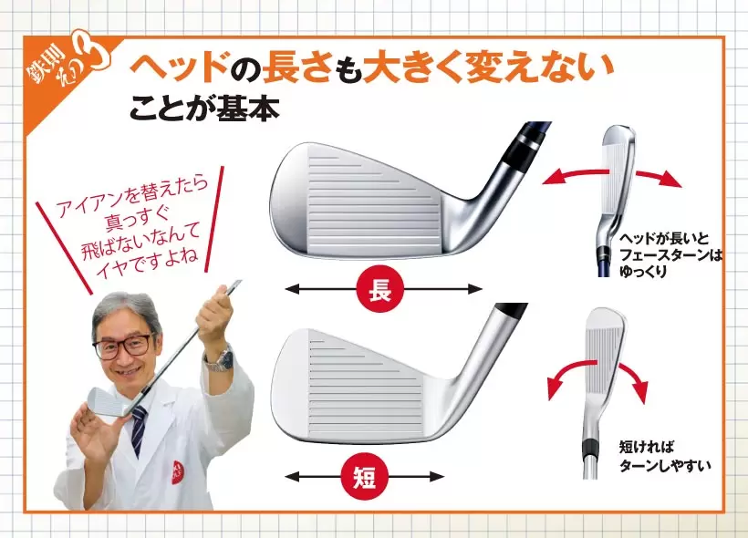 技鉄はグースが小さいものが多く、飛び鉄はグースが大きい傾向だが、同じタイプの中でもモデルによってグースの大小が変わる。