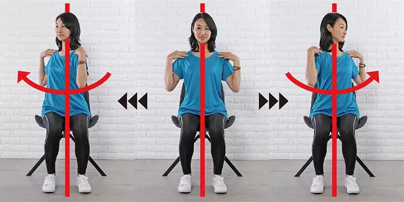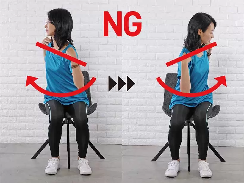 背中は真っすぐ伸ばしたまま、軸をキープ。お尻が椅子から離れたりズレたりしないよう注意。