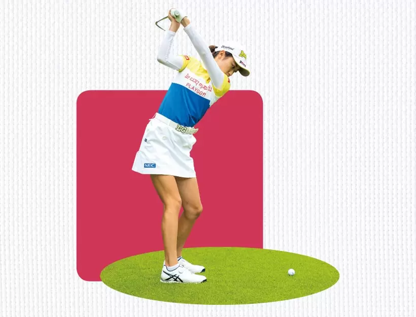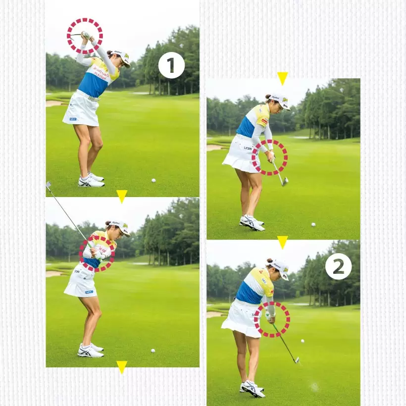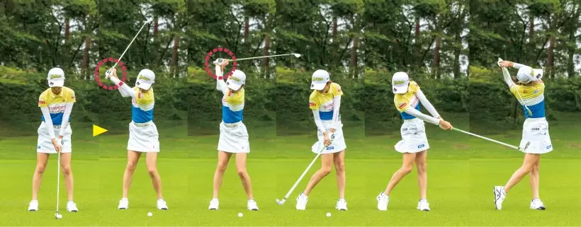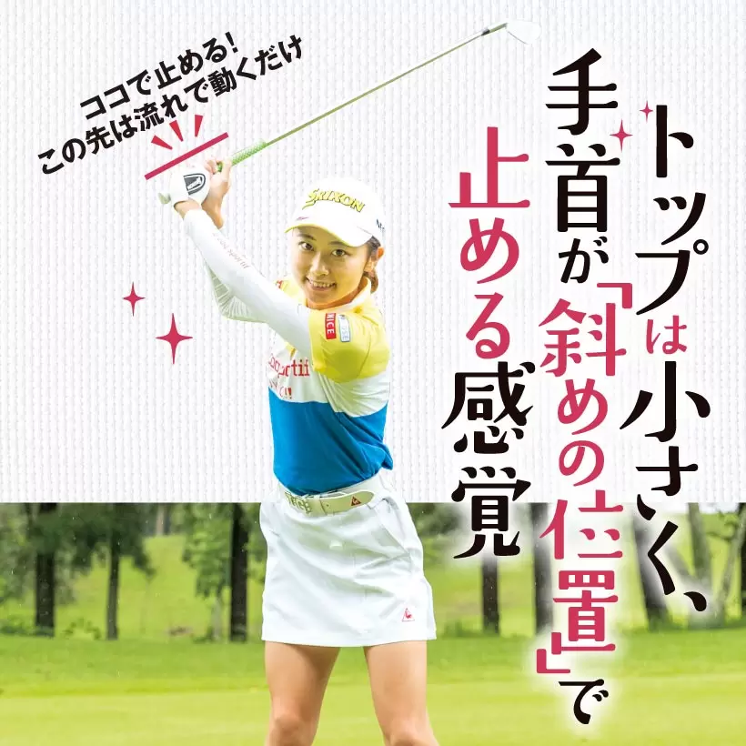 アイアンでのトップの位置を確認するために、練習ではトップで止めてからボールを打つ練習をやっています。トップで止めるのは一瞬だけ。この練習をすると、体を先に動かす感覚もつかめます。