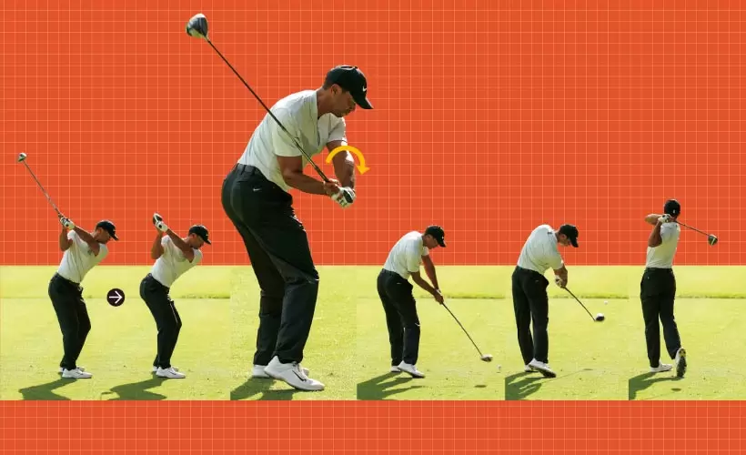 左の前腕部を左方向に回すだけでOK。グリップは左前腕部を左右どちら側にも回しやすいように軽くストロングに握るのがいい。