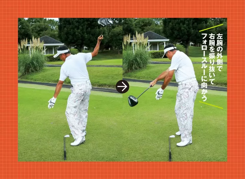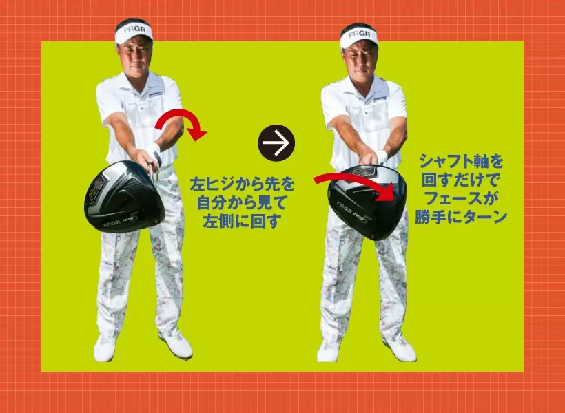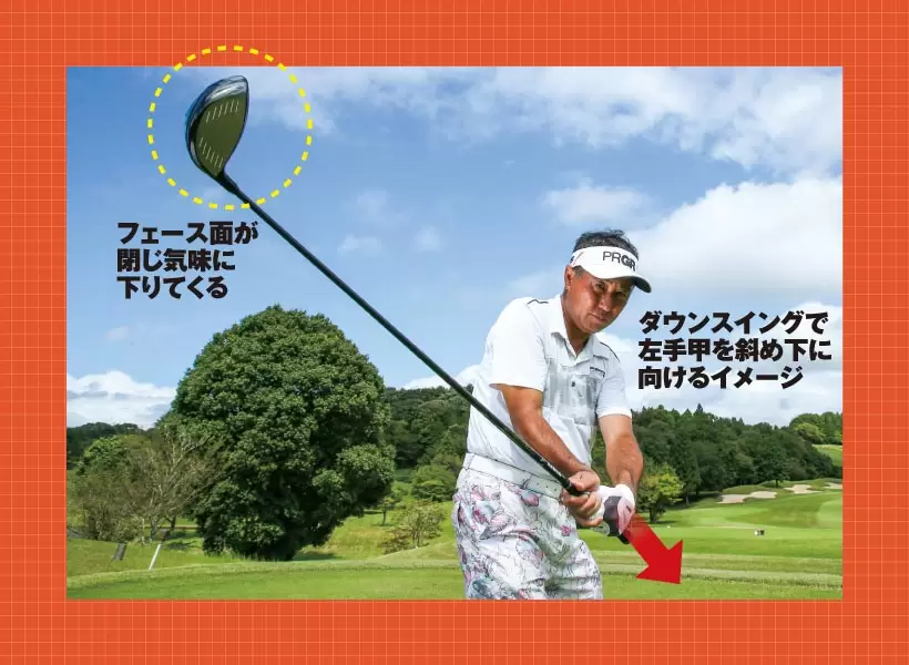 左手甲とフェース面をやや下に向ける感覚で振り下ろすと左前腕部のネジレが生じやすく、フェースが開かなくなる。