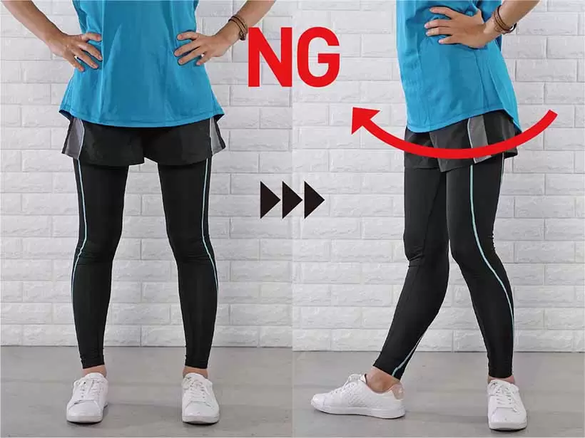 脚と腰が一緒にまわらないように注意。おヘソは常に正面を向くのが正解。