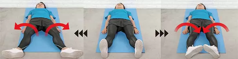 このエクササイズも、脚のつけ根(股関節)から動かすことが一番のポイント。両脚を内側にひねる際は、ヒザを向かい合わせるように。