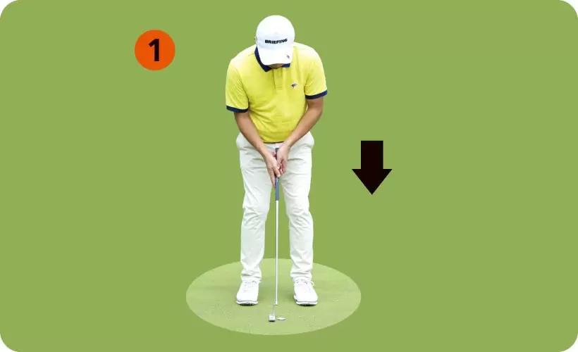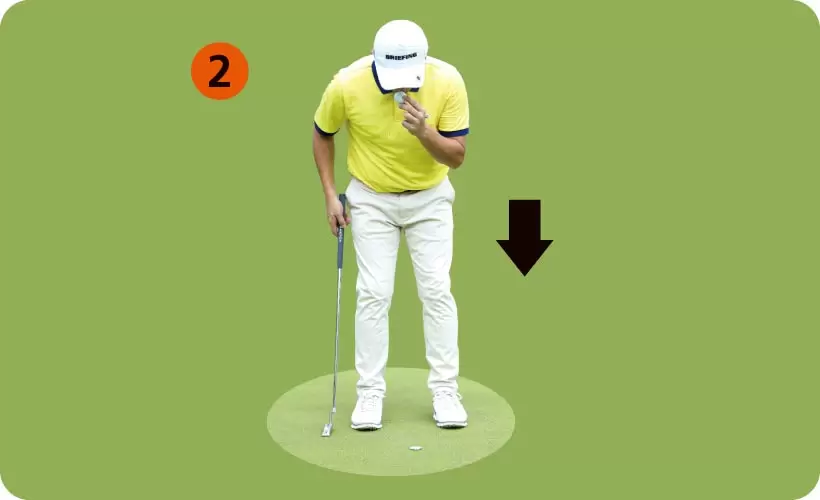 コインマーカーをボールに見立ててパターのアドレスを作る。