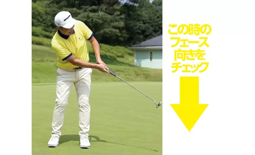グリーンの端から端まで打つ超ロングパットの素振りをしてフォローで止める