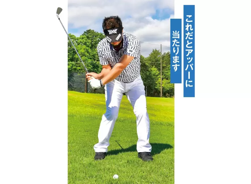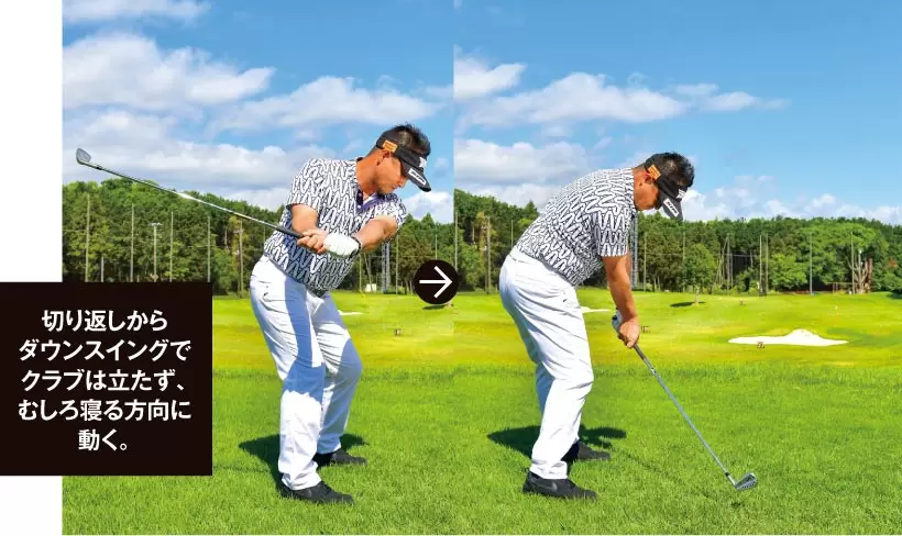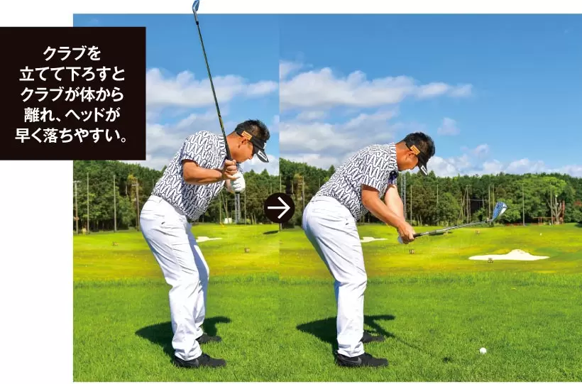 上から入れようとダウンスイングでクラブを立てるイメージをもつと、ヘッドの最下点がインパクトの手前に。