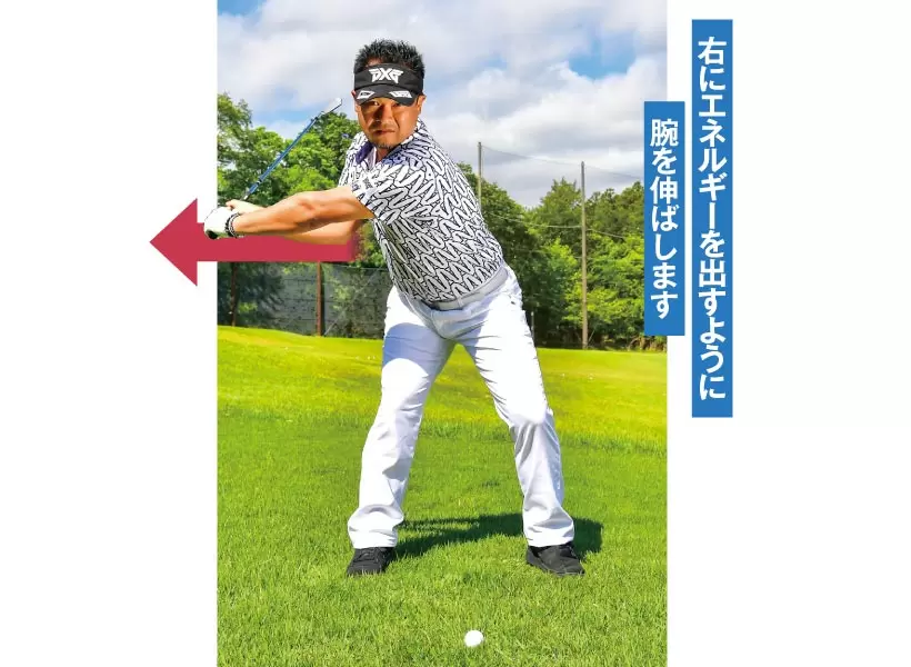右にエネルギーを出すように腕を伸ばします。