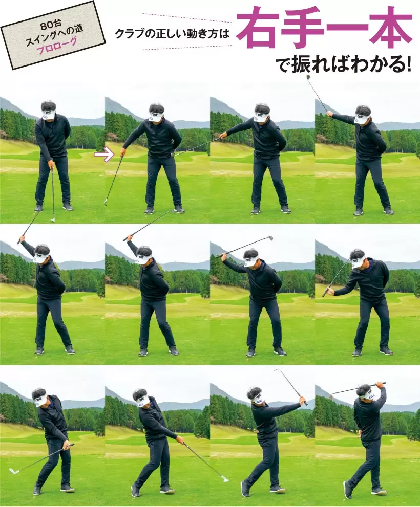 右手一本では始動で手元を先行させるが、ほどなく体も動く。クラブを両手で持った場合も体の動きは必要。クラブと体の関係性を変えなければこれができる。