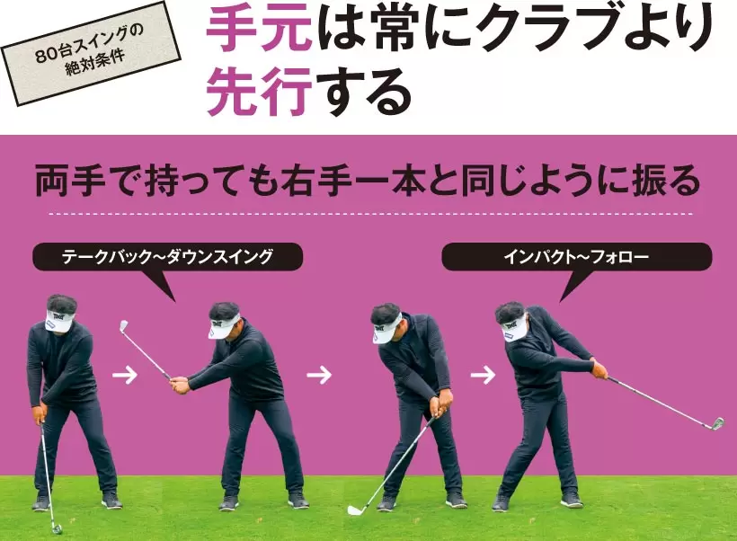 手元は常にクラブより先行していることが、80台スイングの絶対条件。