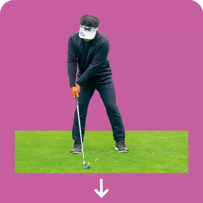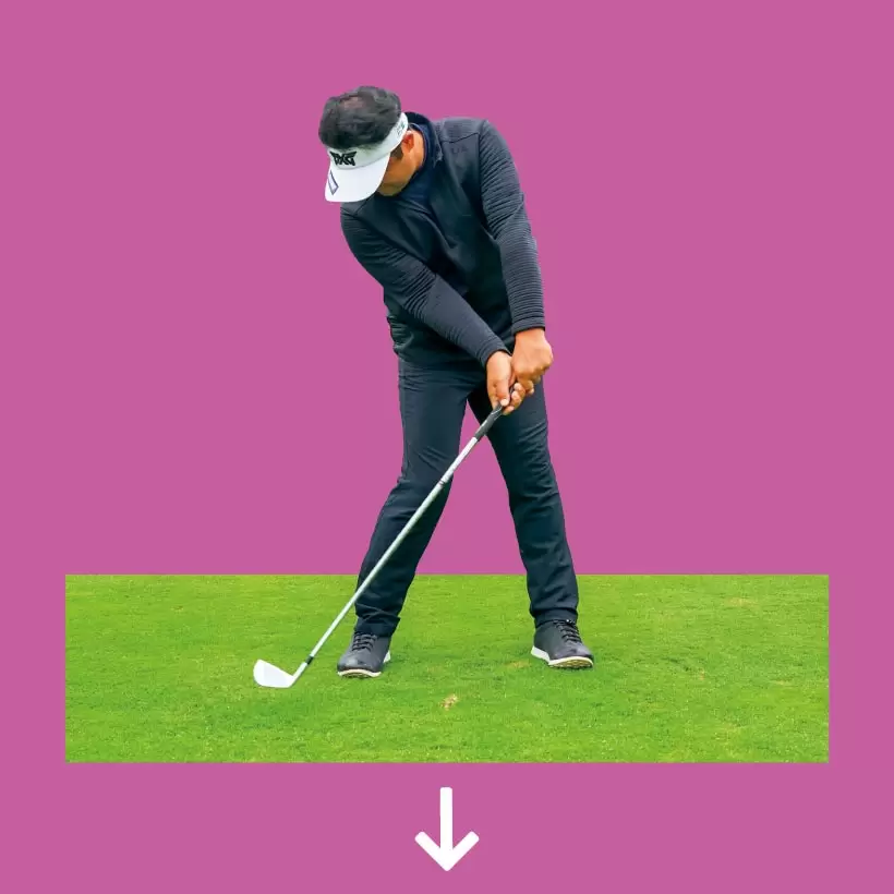 グリップエンドを右方向に引き、この形でダウンスイングするとクラブが寝てシャローに下りるが、これが正解。クラブは立って下りない。
