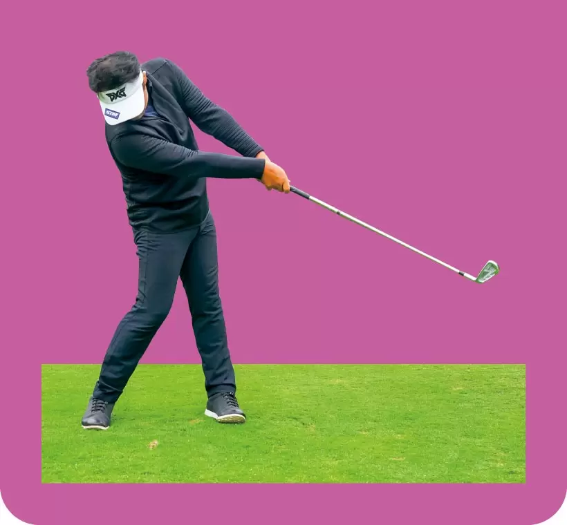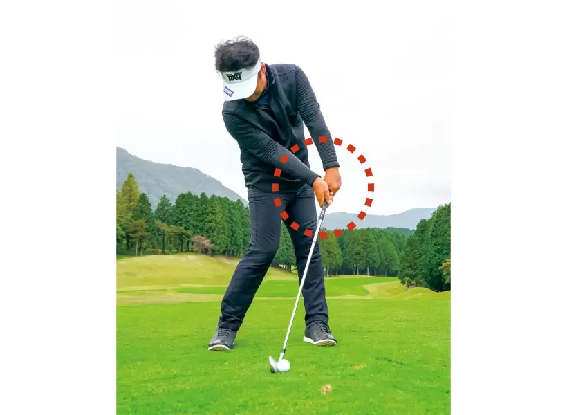 このプロセスではクラブに引っ張られて体が右に流れないよう、左足を踏ん張っておくことも大事。
