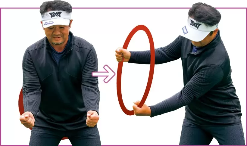 右手一本の要領で振ると、フェースは閉じて上がり、開いて下りてくる。