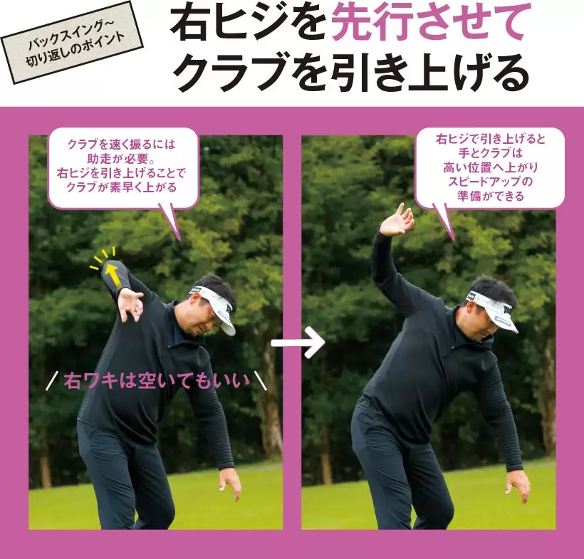 右ヒジを引き上げることで手とクラブが素早く、高い位置へと上がり、スピードアップの準備ができる。ご覧の通り、右ヒジは空いてもいい。