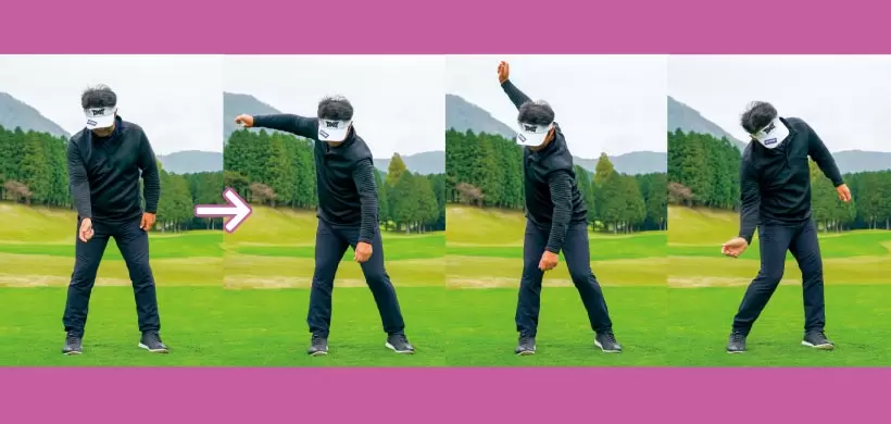 クラブを目標方向に投げると想定した場合、ヒジを外側に振り出したほうが断然投げやすい。