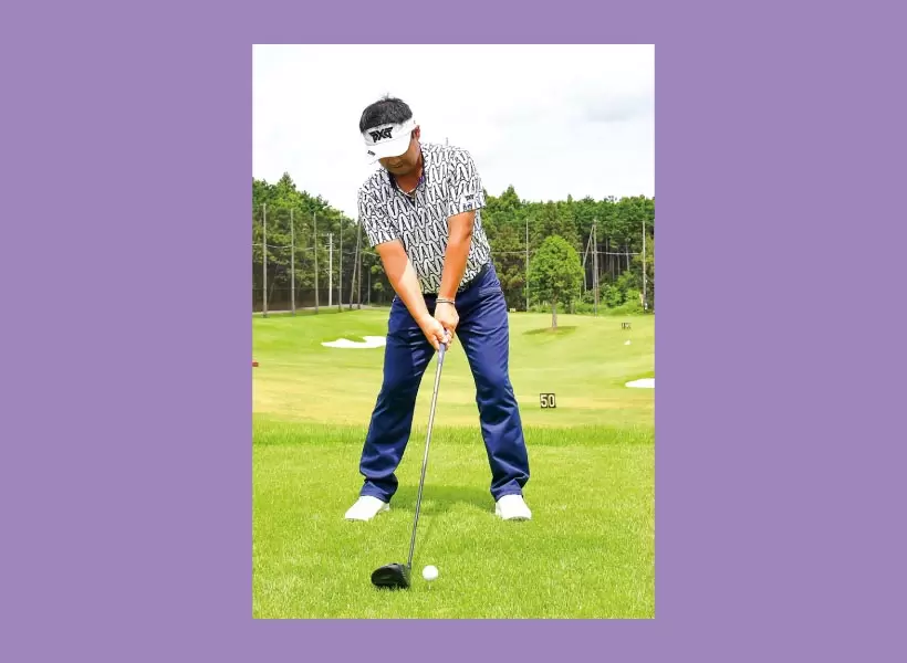 ボールの右サイド(後方)からアドレスするとスクエアに構えやすい。そこからシャット気味にテークバックするのがスライス撲滅の条件。