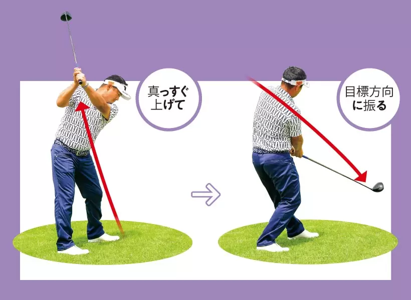 クラブをインサイドに上げるほどダウンスイングがアウトから下りてカット軌道が助長される。