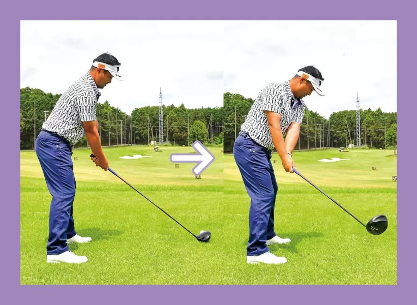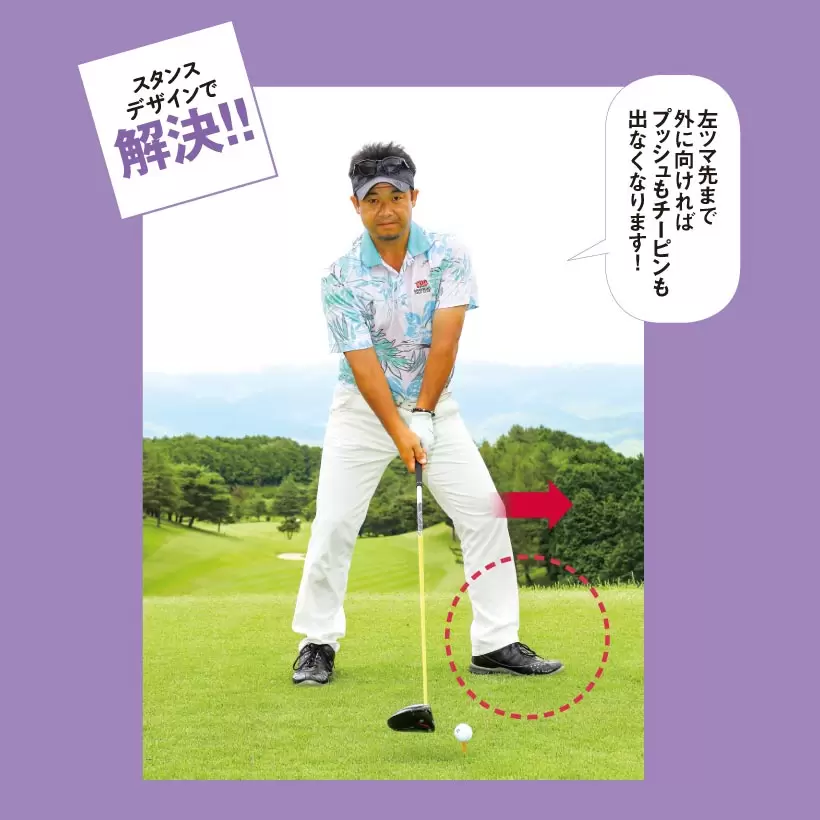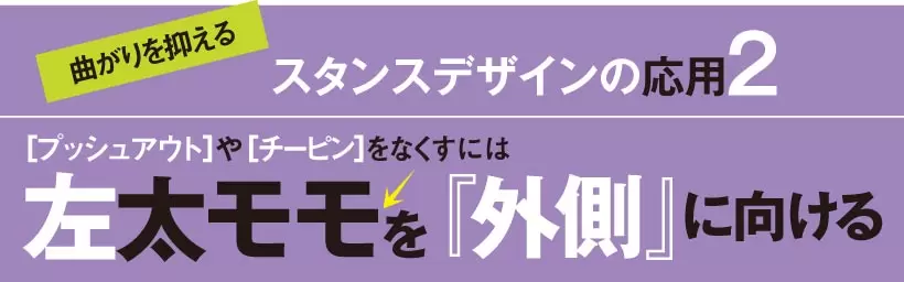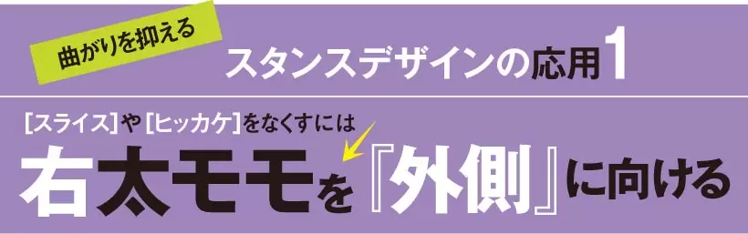 左太モモのみならず、ツマ先まで外に向けると伸び上がりや手打ちが抑えられプッシュアウトやチーピンが出なくなる。