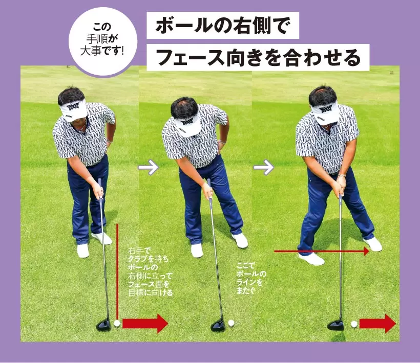 いきなりボールのラインをまたいでしまうとフェースの向きが確認できない。