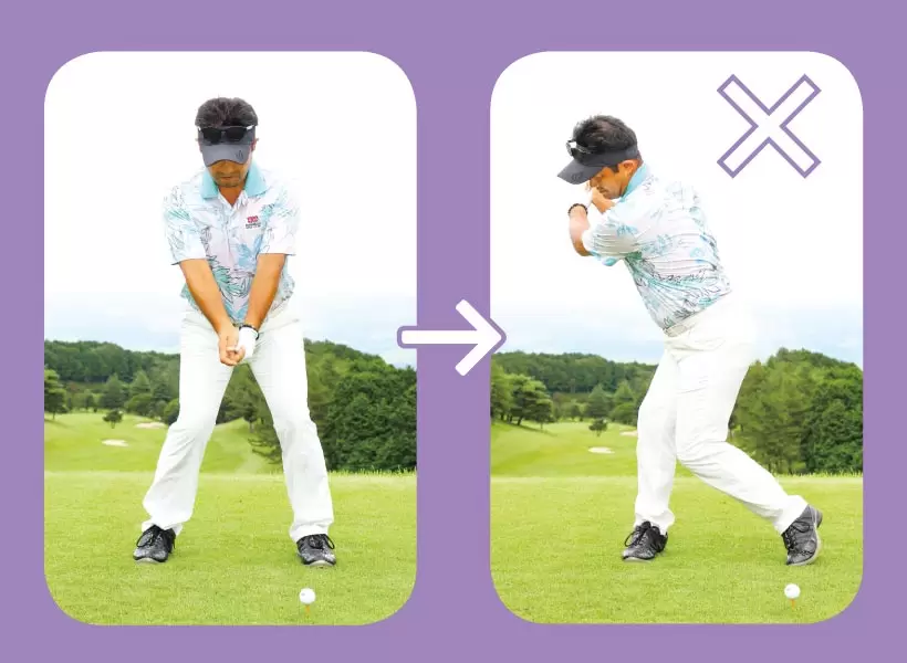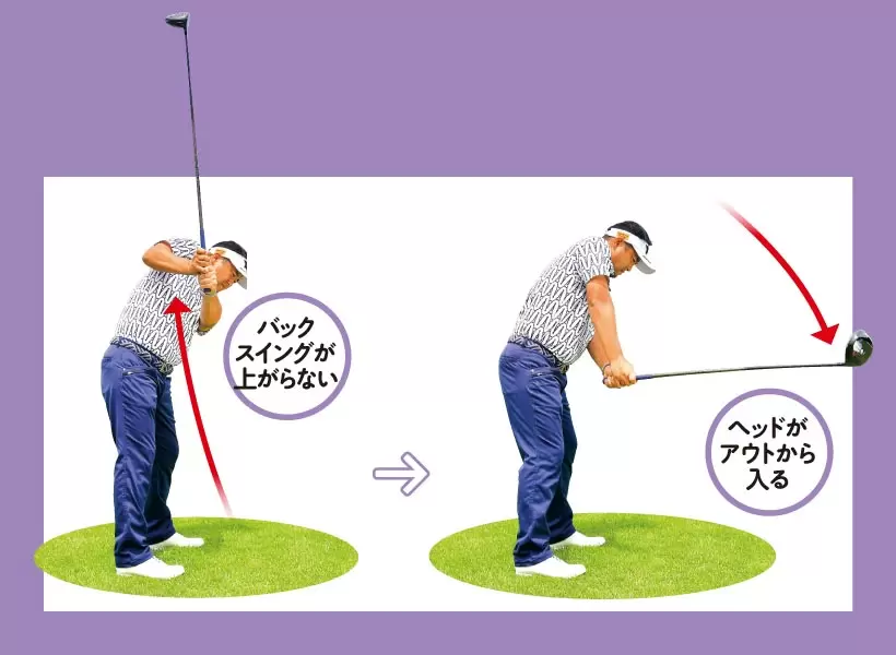 右肩かぶりでバックスイングが上がらず体が伸びる。回転不足になってアウトからヘッドが下りる。
