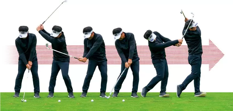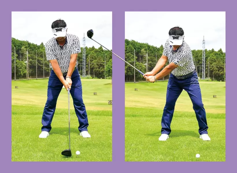 左太モモを外側に向けると左サイドの伸び上がりがなくなりクラブが低い位置に抜ける。下から上に振ることで起こるミスを抑えられ下半身が止まることもない。