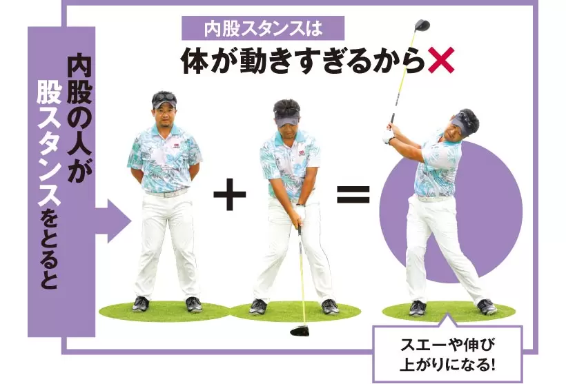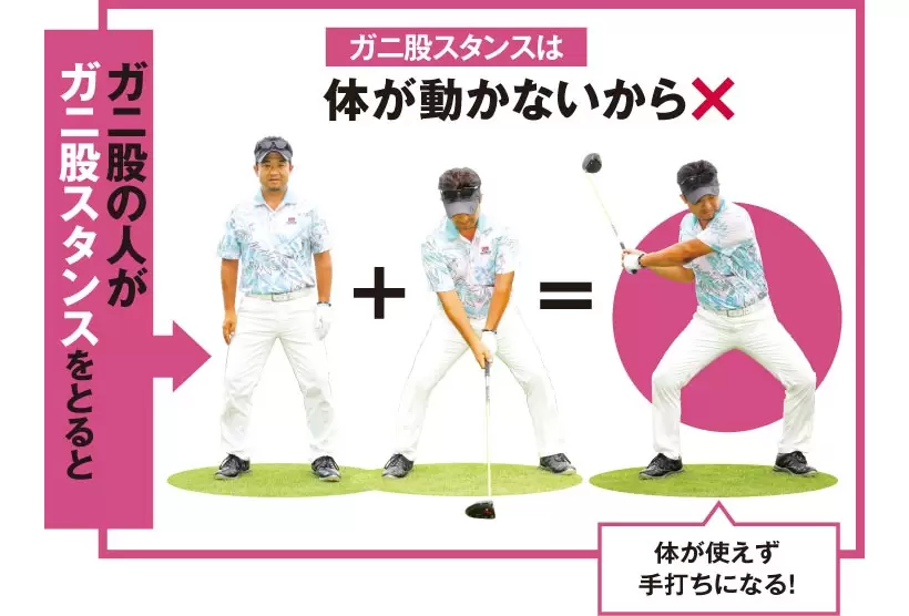 下半身を安定させようとしてガニ股スタンスをとると内股スタンスとは逆に体が動かなくなる。バックスイングやダウンスイングで上体が捻転しづらくなるため、手だけでクラブを動かすカタチになってしまう。