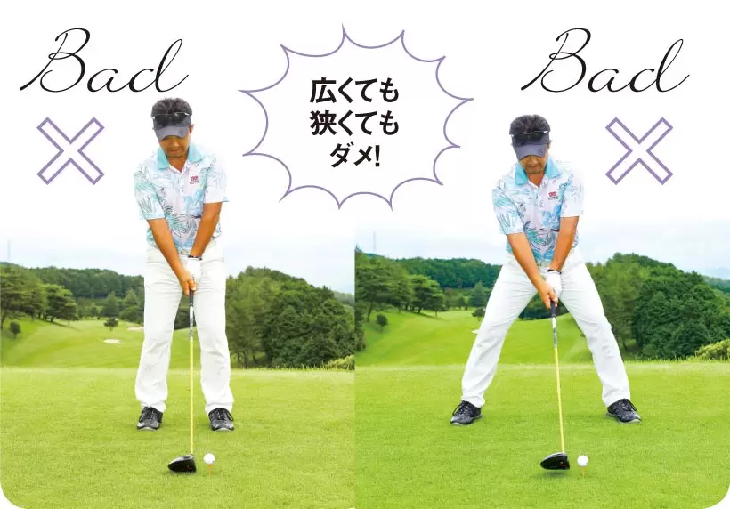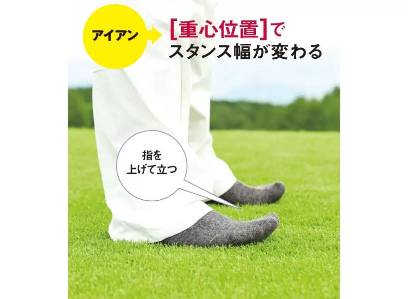 指が上がった状態で安定して立てるのがボールとの最適な距離。このポジションでしっくりくるスタンス幅にする。