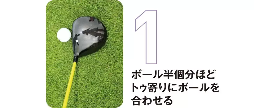 ヘッドとボールを上から見て、フェースのセンターからボール半個分ほどトゥ寄りにボールを合わせる。