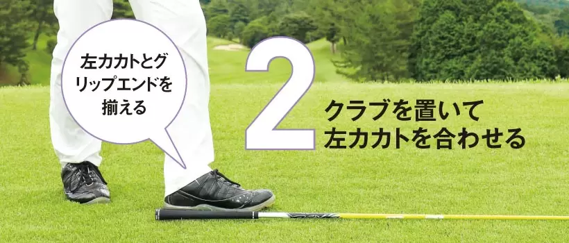 フェースにボールを合わせたらクラブをゆっくり地面に置き、グリップエンド側の先端と左カカトの先端を合わせる。