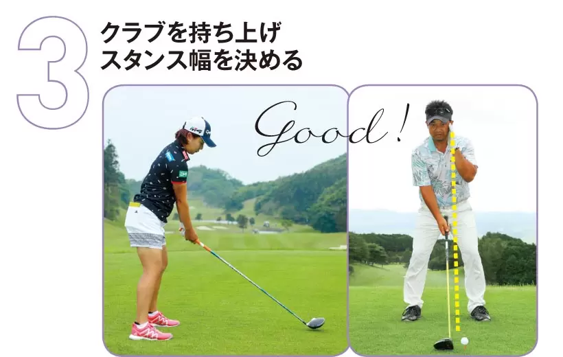左カカトの位置が変わらないようにクラブを持ち上げて動きやすいスタンス幅にする。その際のボール位置は左頬の下が目安。