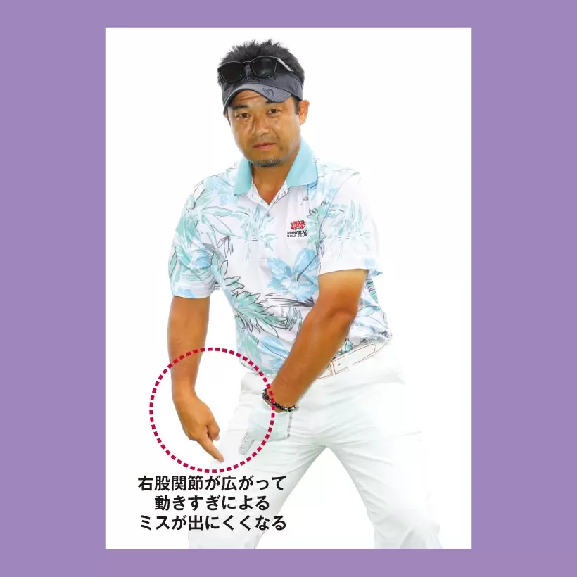 右太モモやツマ先までを外に向けるとバックスイングでのスエーや伸び上がり、さらにはダウンスイングでの突っ込みもなくなる。
