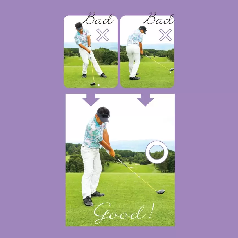 上体が突っ込んでダフる場合は、右太モモを外に向けてスタンスする。