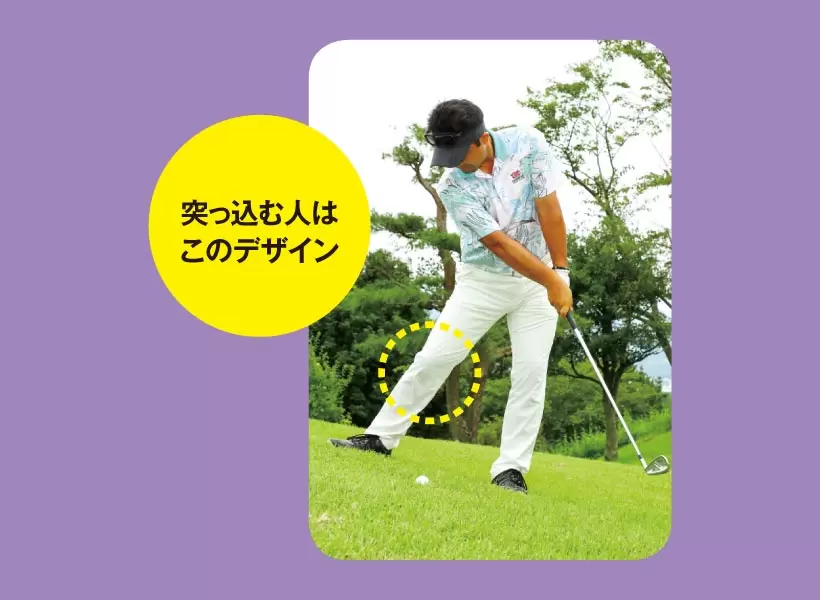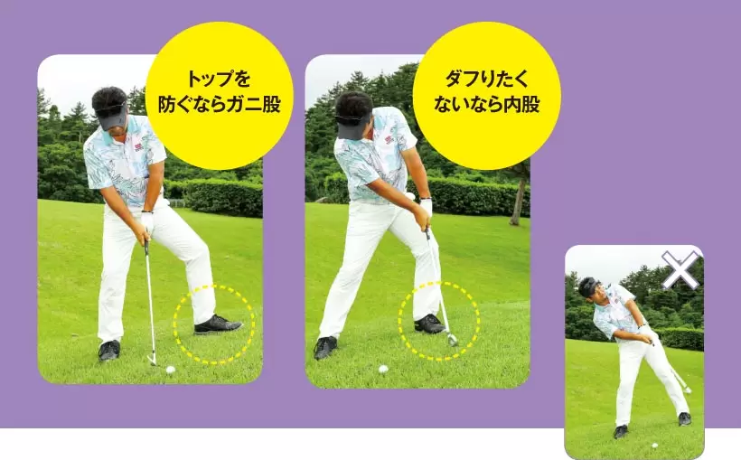 ヘッドが下から入ってダフる場合、右ヒザだけを絞って内股にする。