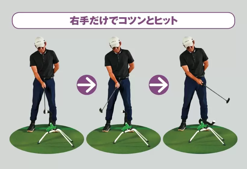 右手だけでヘッドを利かせてヒットするようにすると、スナップ動作が自然と入るようになる。右肩を動かさないのがポイント。