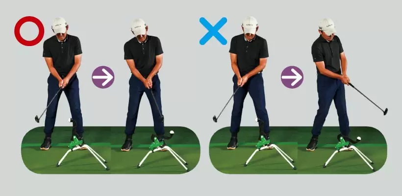 ロフトを立てる、ハンドファーストにするイメージではヘッドが遅れ、スナップが入らない。