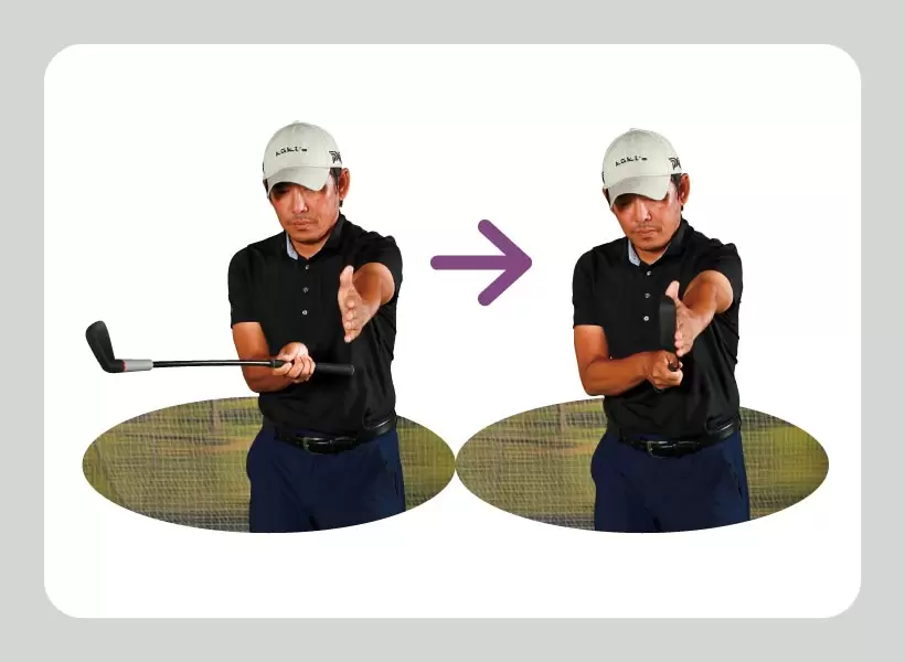 右手はパームでフェース面と一体感を出し、左手は動きを邪魔しないように下から支えるように。左人差し指を右小指に掛ける。