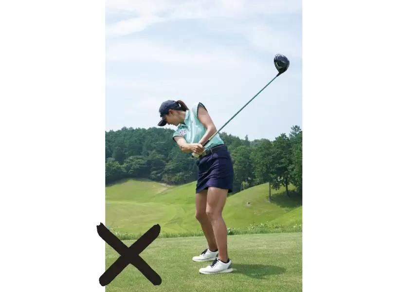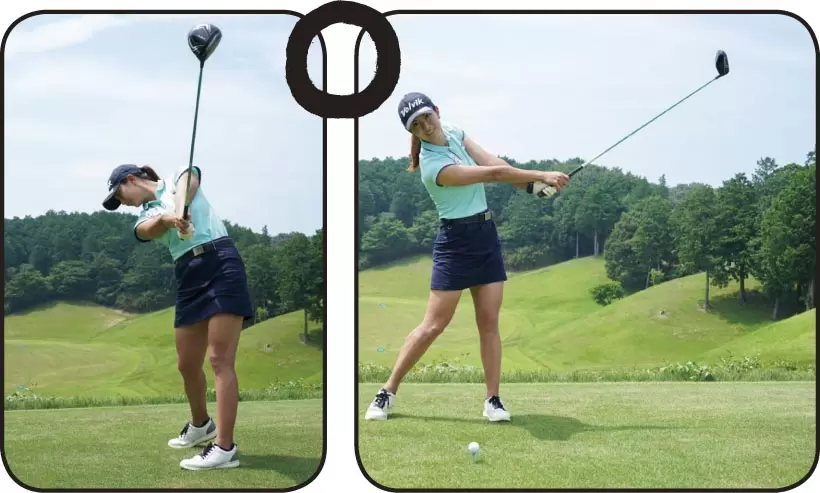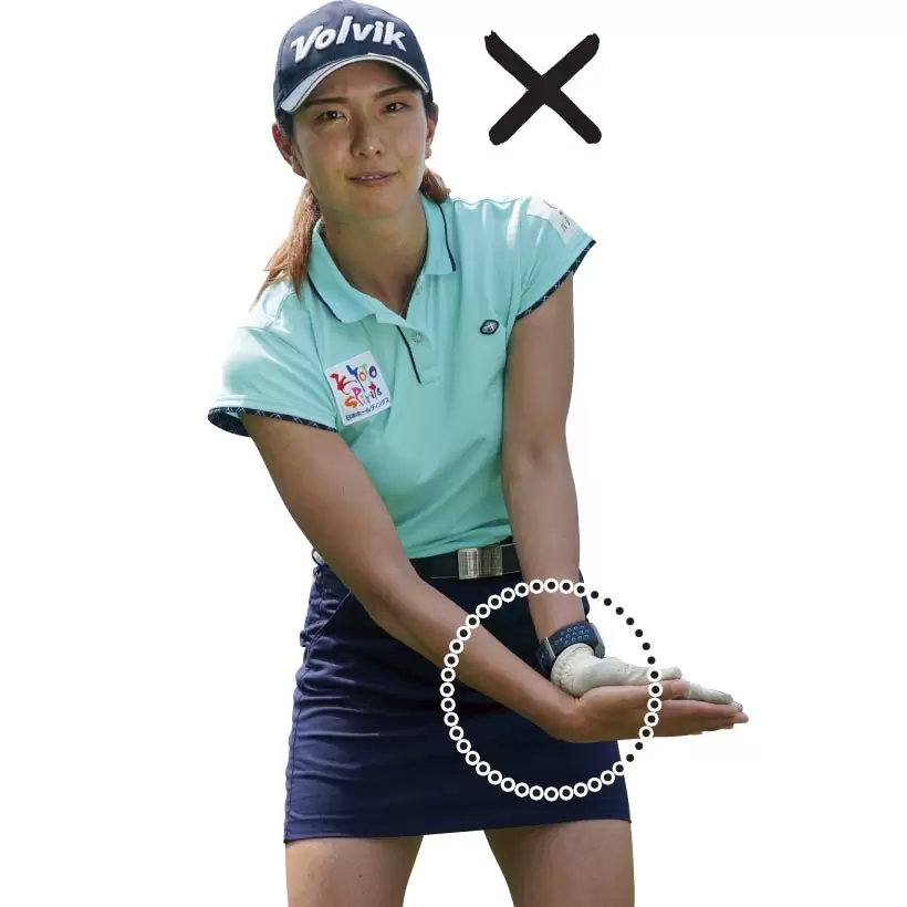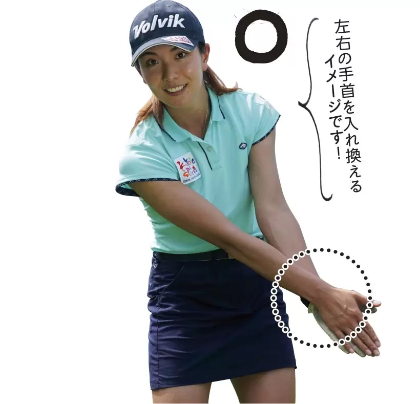 右手の甲が下を向いて、左手の甲が上を向くと、アドレス時の手首の角度をキープしていないスイングになってしまう。