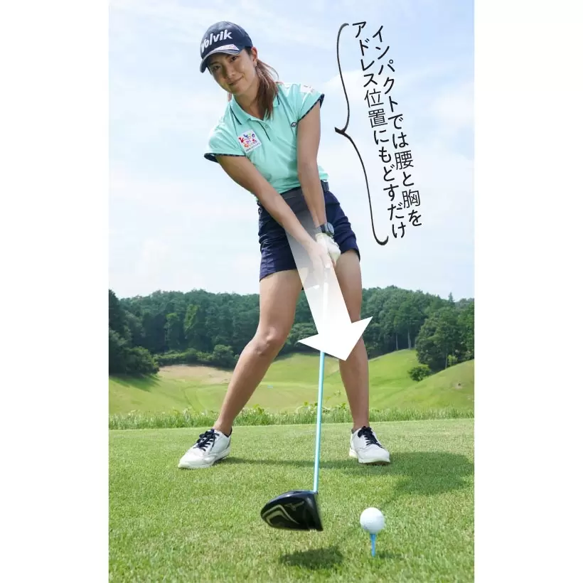 ダウンスイングでは腰が先行しつつ、徐々に腕が追いついて、インパクトでは腰が正面を向いた姿勢でヘッドがボールに当たるのが理想。高島は「腰を正面に向けたままパンチする感覚」と語る。