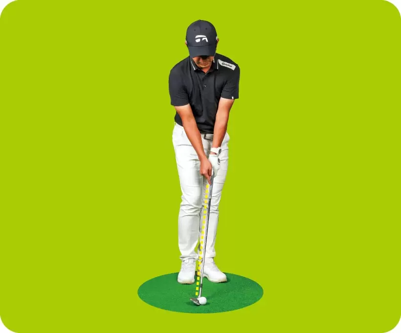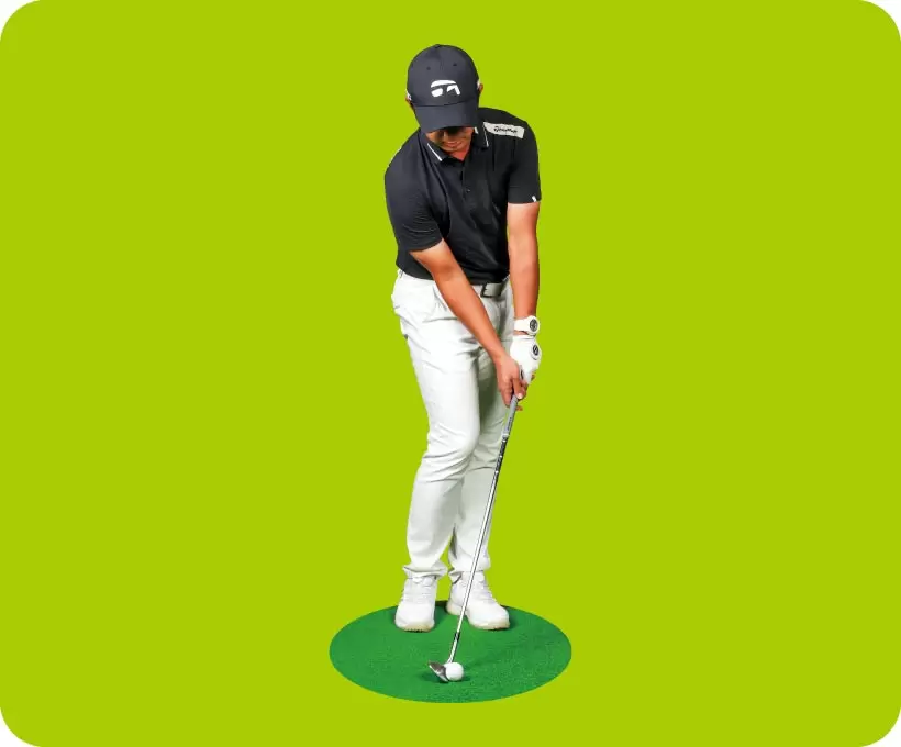 アプローチのアドレスは、まず最下点にヘッドを置き、手元の位置はそのままにしてヘッドだけボールのうしろに移動させるとハンドファーストの構えができる。